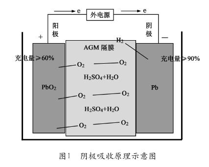 ??蓄電池在充電過程中,負極反應近似為還原反應,所以負極也稱為陰極。蓄電池電池負極活性物質相對于正極有盈余,超細隔板透氣性好,能吸附全部電解液,使電解液在蓄電池內部無流動性,同時又有自動開、閉的安全閥,保證了正極產生的氧氣,在蓄電池內部以循環的方式被陰極吸收,即稱為陰極吸附式原理。陰極吸收原理示意圖如圖1所示。